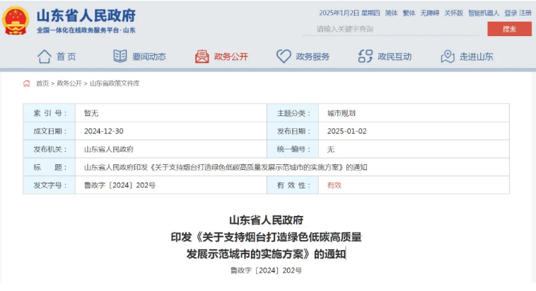 2024年12月30日,山東省人民政府印發《關于支持煙臺打造綠色低碳高質量發展示范城市的實施方案》的通知,文件中提到,拓展綠色電力應用場景。實施電力系統數字化、智慧化改造升級,優先調度可再生能源電力。加快城市級數字化虛擬電廠、能耗及碳排放管理平臺和新型多元化儲能中心項目建設。積極發展綠電交易,擴大綠電消費。打造中集海上漂浮式光伏實證基地、東方電子零碳智能產業園、煙臺港綠色智慧零碳碼頭等示范應用場景。到2027年,非化石能源消費比重達到20%以上。 附政策原文: 山東省人民政府印發《關于支持煙臺打造綠色低碳高質量發展示范城市的實施方案》的通知 魯政字〔2024〕202號 煙臺市人民政府,省政府各部門、各直屬機構,各大企業: 《關于支持煙臺打造綠色低碳高質量發展示范城市的實施方案》已經省委、省政府同意,現印發給你們,請認真貫徹執行。 山東省人民政府 2024年12月30日 (此件公開發布) 關于支持煙臺打造綠色低碳高質量發展示范城市的實施方案 煙臺是全省重要制造業基地和沿海開放城市。為進一步增強煙臺城市發展能級,充分發揮引領帶動作用,加快建設綠色低碳高質量發展示范城市,制定本實施方案。 一、總體要求 堅持以習近平新時代中國特色社會主義思想為指導,深入貫徹黨的二十大和二十屆二中、三中全會精神,全面落實習近平總書記視察山東重要講話精神,完整準確全面貫徹新發展理念,主動服務和融入新發展格局,以綠色低碳高質量發展為主題,著力在發展新質生產力、壯大綠色循環經濟、構建新型能源體系、深化改革擴大開放、建設美麗山東、落實雙碳戰略等方面先行示范,以更高定位開創萬億級城市新局面,堅定扛牢“走在前、挑大梁”的使命擔當、為奮力譜寫中國式現代化山東篇章作出更大貢獻。 主要目標是:到2027年,示范城市建設取得重要突破,現代化產業體系核心競爭力持續增強,清潔能源綜合利用水平全國領先,綠色低碳科技創新能力大幅提高,區域城鄉協調聯動發展格局更加優化,城市人居環境和居民生活品質顯著躍升。到2030年,全面建成綠色低碳高質量發展示范城市。 二、加快建設現代化產業體系,大力發展新質生產力 (一)做強標志性產業集群。推動制造業高端化、智能化、綠色化,進一步壯大高端化工、汽車、清潔能源、航空航天、生物醫藥等優勢產業,爭創國家新型工業化示范區。以裕龍煉化一體化、萬華新材料項目為引領,加快發展乙烯、聚氨酯等化工新材料,打造世界級綠色石化產業集群。以通用東岳奧特能超級工廠、濰柴(煙臺)新能源動力項目為引領,加快發展新能源汽車、動力電池產業,打造百萬輛汽車產業集群。以海陽核電、招遠核電等項目為引領,加快發展核風光氫儲清潔能源裝備產業鏈,打造千億級清潔能源產業集群。以東方航天港項目為引領,構建從火箭發射到衛星信息的全鏈生態,打造航空航天產業集群。以藍色藥谷生命島項目為引領,加快發展生物創新藥、醫用同位素、合成生物等,打造現代生物制藥產業集群。到2027年,規上工業總產值達到1.7萬億元以上。(牽頭單位:省工業和信息化廳、省發展改革委,責任單位:省能源局) (二)做優現代海洋產業。實施海洋牧場“百箱計劃”,高水平建設長島“藍色糧倉”海洋經濟開發區。加快建設蓬萊海上風電國際母港、空天海智造、中集零碳智造等項目,支持培育現代漁業、海工裝備、海洋新能源等省級海洋特色產業集聚區,打造世界領先的海工裝備制造基地。到2027年,海洋生產總值達到3000億元以上。(牽頭單位:省發展改革委、省海洋局,責任單位:省工業和信息化廳、省農業農村廳、省能源局) (三)做大數字經濟產業。深入實施綜合算力提質、“智改數轉”工程,加快橙色云工業互聯網平臺、煙臺城市智算中心建設,謀劃建設萊州灣、套子灣海底數據中心和LNG冷能型數據中心,成立數字經濟產業聯盟,培育一批國家、省級工業互聯網平臺和智能工廠,打造煙臺總部經濟基地、東方電子智慧能源創新產業園等數字經濟集聚區。到2027年,規上工業企業數字化轉型基本實現全覆蓋,數字經濟核心產業增加值占比達到13.5%。(牽頭單位:省工業和信息化廳,責任單位:省大數據局、省發展改革委) (四)培育發展未來產業。支持煙臺市培育新一代核能、生命科學、深海空天、人工智能、人形機器人、新型電子材料等六大未來產業,建設數字智能(光電傳感)、南山航空材料產業園等未來產業加速園,規劃建設未來產業研究院,設立未來產業發展基金。到2027年,未來產業產值達到1300億元。(牽頭單位:省發展改革委,責任單位:省工業和信息化廳、省科技廳) (五)增強科技創新策源能力。高水平建設先進材料與綠色制造山東省實驗室、新藥創制山東省實驗室,支持煙臺建設核能領域高能級創新平臺,支持萬華化學參與先進材料領域全國重點實驗室重組。指導煙臺深度融入全省“2+N”人才聚集雁陣格局,打造一批開放程度較高、創新資源密集、人才吸引力強的集聚區。依托泰山人才工程、領軍人才筑峰計劃、卓越工程師培育專項行動,精準引育高層次人才,持續壯大科技領軍人才、青年科學家隊伍。建立多學科交叉融合人才培養機制,積極爭創全國產教融合試點城市。到2027年,全社會研發經費投入強度達到2.8%。(省科技廳、省委組織部、省教
