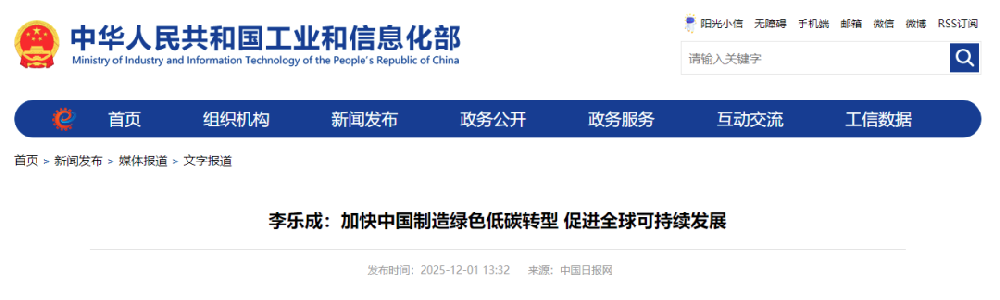 2025年12月1日,《中國日報》刊發(fā)工業(yè)和信息化部黨組書記、部長李樂成署名文章,題為《加快中國制造綠色低碳轉(zhuǎn)型促進全球可持續(xù)發(fā)展》。文章指出,加強綠色產(chǎn)業(yè)國際合作。中國制造將秉持共商共建原則,利用好雙邊和多邊國際合作機制,深化綠色技術(shù)、綠色裝備、綠色貿(mào)易、綠色標準等方面交流合作。鼓勵中國光伏、風電、鋰電池、新能源汽車等優(yōu)勢企業(yè)“走出去”,在“一帶一路”等國家投資建設綠色能源項目,推廣綠色基礎設施和交通解決方案。積極參與綠色低碳國際規(guī)則制定,加強國際公約履約能力建設。 全文如下: 在全球氣候治理深化和能源革命加速的背景下,制造業(yè)綠色低碳轉(zhuǎn)型已成為國際社會的普遍共識。習近平主席提出“綠水青山就是金山銀山”的理念,指引中國經(jīng)濟發(fā)展范式發(fā)生了根本轉(zhuǎn)變。中國作為負責任的制造業(yè)大國,以實現(xiàn)新型工業(yè)化為關鍵任務,把綠色低碳作為新型工業(yè)化的生態(tài)底色,協(xié)同推進降碳、減污、擴綠、增長,為全球可持續(xù)發(fā)展貢獻了中國智慧和解決方案。 強化綠色理念引領。理念是行動的先導,中國制造綠色轉(zhuǎn)型的深層動力正是源于習近平生態(tài)文明思想,“綠水青山就是金山銀山”理念的提出,是對傳統(tǒng)工業(yè)發(fā)展范式的超越,引領中國走上了高質(zhì)量發(fā)展與高水平保護并舉之路。在科學理念指引下,中國構(gòu)建了碳達峰碳中和“1+N”政策體系,將碳達峰碳中和這一宏偉目標轉(zhuǎn)化為可落地、可衡量的具體行動,通過綠色標準、綠色金融、碳交易市場等政策工具,為綠色低碳轉(zhuǎn)型創(chuàng)造穩(wěn)定且可預期的市場環(huán)境。近年來,中國的經(jīng)濟發(fā)展對能源的依賴度逐步降低。2021—2024年,中國以年均3%左右的能源消費增速支撐了年均5%以上的工業(yè)經(jīng)濟增長。綠色轉(zhuǎn)型催生出強大的新經(jīng)濟動能,中國建成了全球最大新能源產(chǎn)業(yè)鏈,2024年,中國風光發(fā)電總裝機超過12億千瓦,提前6年完成國家自主貢獻提出的2030年裝機目標,全球超過一半的電動汽車在中國道路上行駛。 深化綠色技術(shù)創(chuàng)新。科技創(chuàng)新是制造業(yè)綠色轉(zhuǎn)型的核心驅(qū)動力。中國將綠色技術(shù)創(chuàng)新納入國家創(chuàng)新體系,在政府戰(zhàn)略支持、規(guī)模經(jīng)濟驅(qū)動、產(chǎn)業(yè)生態(tài)協(xié)同的共同作用下,綠色技術(shù)創(chuàng)新成果顯著。國家知識產(chǎn)權(quán)局發(fā)布的《2024年中國專利調(diào)查報告》顯示,中國近五成企業(yè)已開展或計劃開展綠色技術(shù)創(chuàng)新。過去10年間,中國推動全球風電和光伏技術(shù)平均度電成本分別累計下降超過60%和80%。傳統(tǒng)行業(yè)綠色技術(shù)創(chuàng)新也取得了突破,百萬噸級氫冶金產(chǎn)線、30萬噸級綠色合成氨已經(jīng)實現(xiàn)全流程工藝貫通,百萬噸級碳捕集利用與封存(CCUS)項目全面建成投產(chǎn)。這些技術(shù)的突破和應用,為更大規(guī)模、更深層次的制造業(yè)綠色低碳轉(zhuǎn)型奠定了基礎。 普及綠色制造模式。綠色制造是一種現(xiàn)代化的制造模式,具有低消耗、低排放、高效率、高效益的特點。中國構(gòu)建了以綠色工廠、綠色工業(yè)園區(qū)、綠色供應鏈和綠色產(chǎn)品為關鍵載體的綠色制造體系,將綠色發(fā)展理念融入工業(yè)生產(chǎn)全過程。截至目前,中國培育了6430家綠色工廠、491家綠色工業(yè)園區(qū)、727家綠色供應鏈企業(yè),推廣超4萬種綠色產(chǎn)品。其中,綠色工廠產(chǎn)值占制造業(yè)總產(chǎn)值比重從2020年的9%提高到20%,綠色工業(yè)園區(qū)單位工業(yè)增加值能耗、水耗僅為中國平均水平的2/3和1/4,固廢平均處置利用率超過95%。越來越多的中國企業(yè)將綠色設計、綠色采購等融入供應鏈管理,帶動上下游企業(yè)共同實施綠色低碳改造,部分龍頭企業(yè)探索供應鏈碳足跡管理,對產(chǎn)品全生命周期進行碳管理。 貢獻綠色轉(zhuǎn)型方案。中國制造通過提供高質(zhì)量的綠色技術(shù)和產(chǎn)品,為全球綠色轉(zhuǎn)型提供了切實可行的路徑。中國的可再生能源產(chǎn)品出口到全球200多個國家和地區(qū),滿足全球80%以上的光伏組件和70%的風電裝備需求,幫助世界各國特別是發(fā)展中國家獲得清潔、可靠、用得起的能源。以光伏為例,2021—2024年,中國累計生產(chǎn)約15.6萬億千瓦光伏組件,為全球提供了約3.2萬億千瓦時綠色電力,幫助各國減排二氧化碳約25.4億噸。中國同100多個國家和地區(qū)開展了綠色能源合作項目,為當?shù)靥峁┝烁哔|(zhì)量的綠色能源裝備、可負擔的綠色電力。這些項目充分展示了中國方案在幫助發(fā)展中國家應對氣候變化和發(fā)展經(jīng)濟方面的實際效果。 當前,全球氣候治理歷經(jīng)曲折,個別國家逆流而動,對國際規(guī)則和國際秩序造成嚴重沖擊。中國制造業(yè)綠色低碳轉(zhuǎn)型路徑的選擇,彰顯了中國經(jīng)濟培育新質(zhì)生產(chǎn)力、實現(xiàn)高質(zhì)量發(fā)展的決心,更表明中國對全球氣候治理的莊嚴承諾。2025年9月,習近平主席在聯(lián)合國氣候變化峰會宣布了中國新一輪國家自主貢獻(NDC)目標。明確提出到2035年,中國全經(j