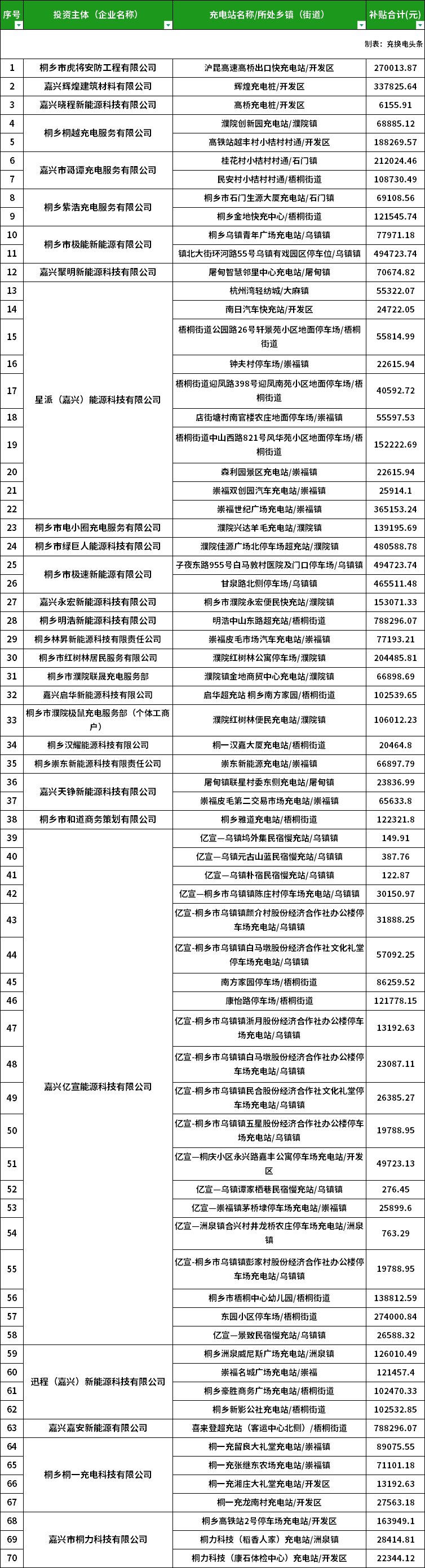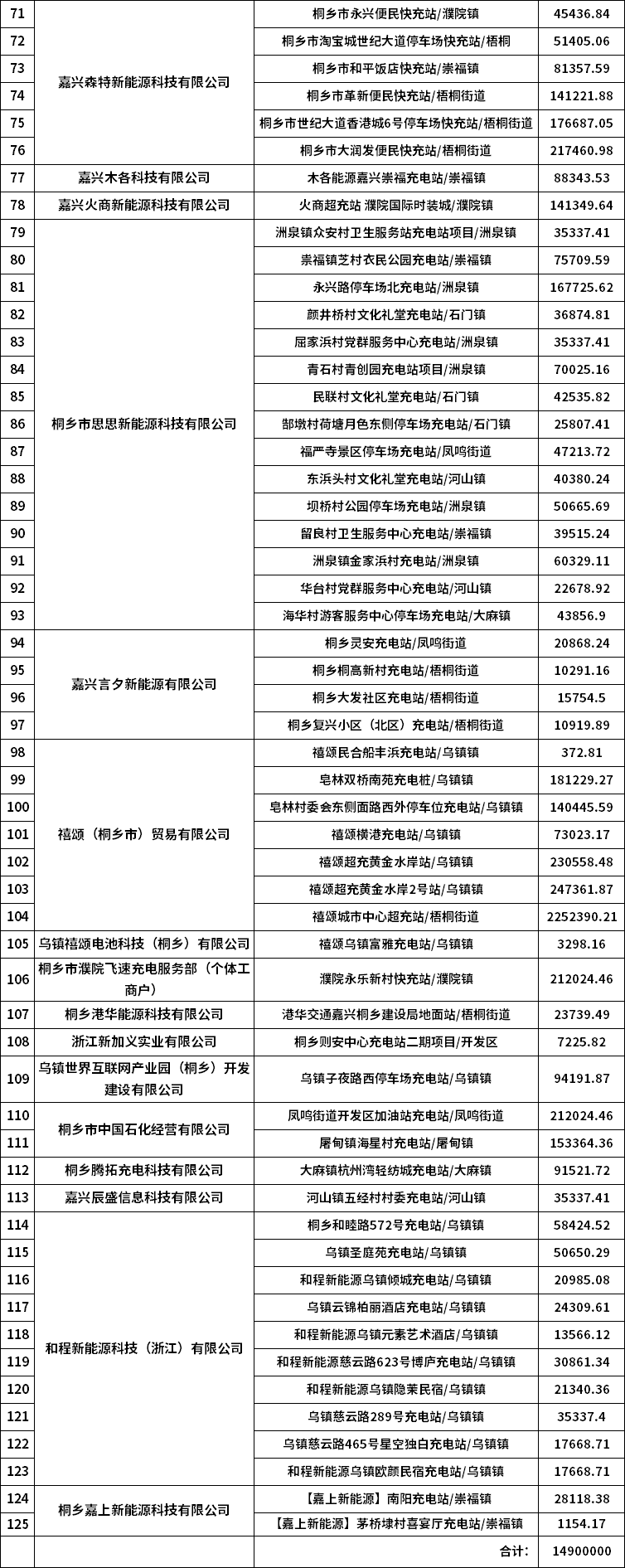 7月15日,浙江桐鄉市發展和改革局印發關于2024年度第二批新能源汽車充電基礎設施獎勵資金補貼項目的二次公示。 根據2024年度第二批新能源汽車充電基礎設施獎勵資金二次公示名單顯示,桐鄉市虎將安防工程有限公司、嘉興輝煌建筑材料有限公司、嘉興曉程新能源科技有限公司、桐鄉桐越充電服務有限公司、嘉興市哥譚充電服務有限公司、桐鄉紫浩充電服務有限公司、桐鄉市極能新能源有限公司、嘉興聚明新能源科技有限公司、星派(嘉興)能源科技有限公司、桐鄉市電小圈充電服務有限公司、桐鄉市綠巨人能源科技有限公司等44家企業,125座充電站獲獎補資金。 補貼金額:14900000元。 文件如下: 關于2024年度第二批新能源汽車充電基礎設施獎勵資金補貼項目的二次公示 根據《關于明確新能源汽車公用充電基礎設施獎勵資金使用有關事項的通知》(桐發改〔2024〕45號)及有關工作安排,桐鄉市發改局于2025年3月20日-4月4日啟動2024年度第二批新能源汽車充電基礎設施獎勵資金補貼申報工作,并于2025年6月13日-6月15日對補貼名單及補貼金額進行了公示。現對公示期間提出異議并審核通過的名單進行補充。 現予二次公示,公示三天(2025年7月15日-7月17日),公示三天內如有異議,請向桐鄉市發展和改革局反映。 聯系電話:0573-88028700。 2024年度第二批新能源汽車充電基礎設施獎勵資金二次公示名單.xls 桐鄉市發展和改革局 2025年7月15日 來源:桐鄉市發展和改革局